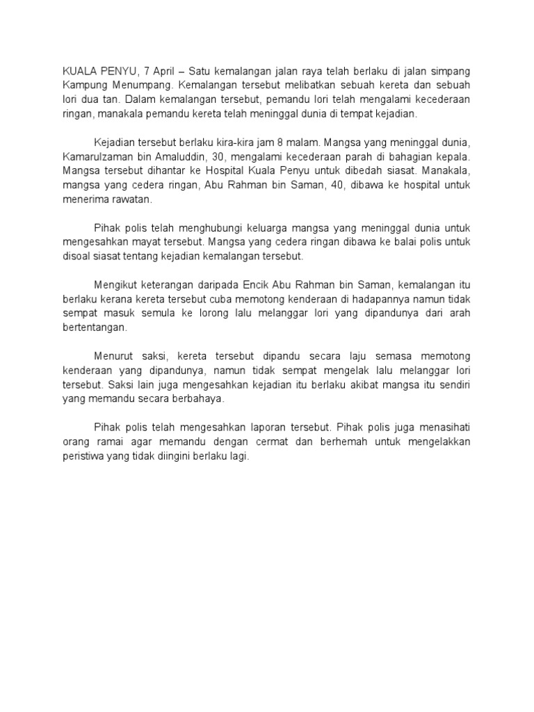 Menurut Ketua Polis Daerah Penguasa Polis Daud Osman pemandu lori itu memandu dalam keadaan mabuk dan tidak dapat mengawal. Contoh Karangan Jenis Berita Anda pemberita dari sebuah akhbar tempatan. Salah satu ciri karangan yakni memiliki kesatuan yang baik.